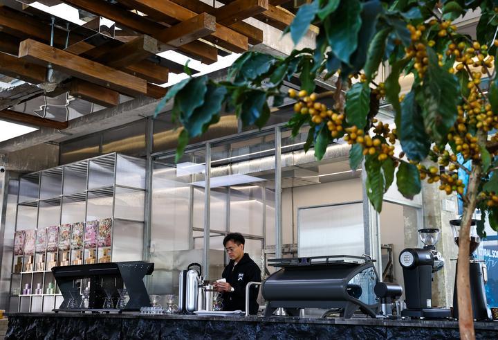 2025年12月10日,旅居云南的韩君玮在位于昆明的南来盛咖啡店内制作咖啡。韩君玮自清华大学毕业后,已在咖啡行业耕耘十余年。2024年,他受聘成为云南一家老字号咖啡品牌的品牌总顾问,从此投身到云南咖啡的产品研发和品牌推广工作中。一年多来,他每月都会来到昆明,短则几天,长则数周,开启了一种“半旅居、半工作”的生活模式。“云南风景优美、气候宜人,我很享受这样的状态。”韩君玮说。