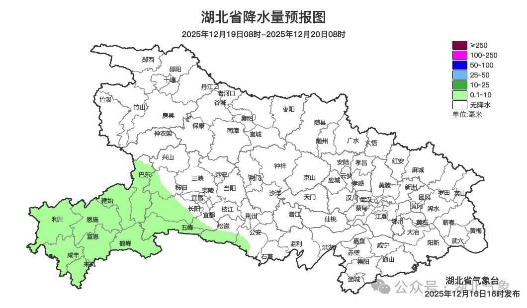 12月19日08时-20日08时,鄂西北西部、鄂西南、江汉平原南部多云转小雨;其他地区晴天到多云。最高气温中西部16~20℃、东部20~24℃,最低气温中西部2~6℃、东部7~11℃,偏南风2到3级,晚上转偏北风3到4级、阵风5到7级。