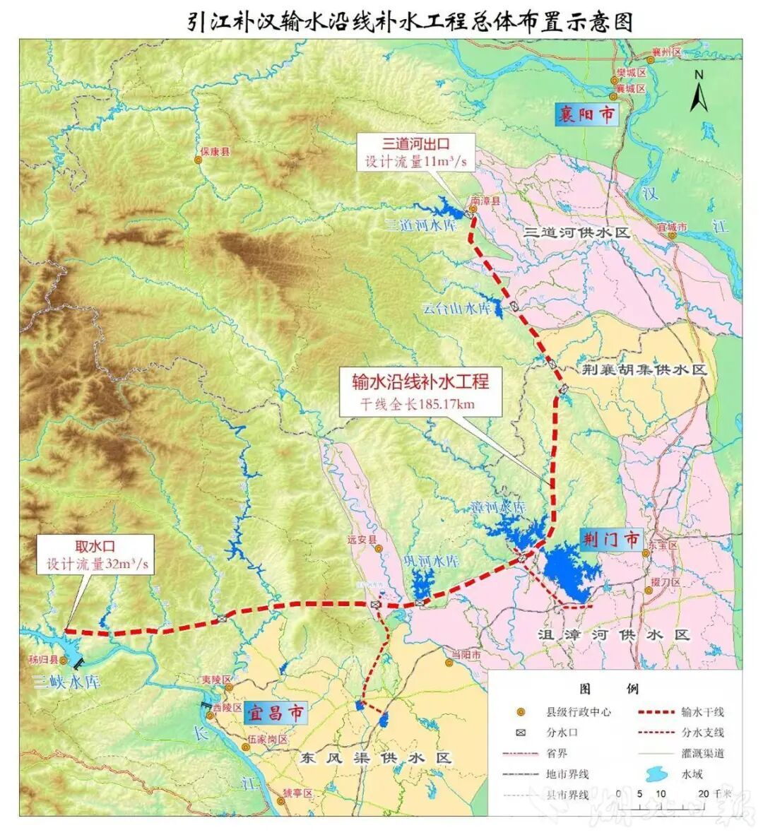 干线设东风渠、远安、巩河、漳河、云台山、三道河6个分水口,以及汤渡河、东宝、荆襄胡集3个应急分水口。其中宜昌境内线路长约95公里,初步拟定宜昌年分配水量为1.68亿立方米。