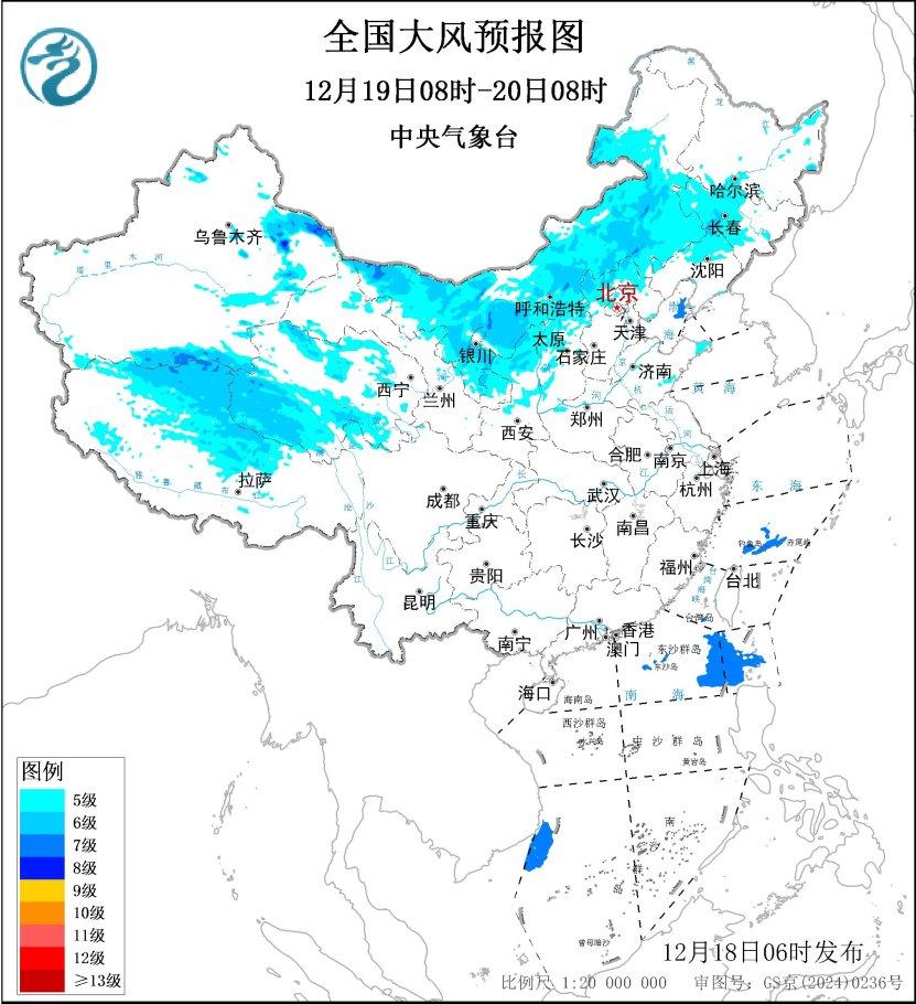 12月19日08时至20日08时,新疆东部、内蒙古、青海、西藏北部、宁夏、甘肃东部、陕西北部、山西北部、河北北部、吉林中西部、辽宁北部、山东半岛等地部分地区有5~6级、阵风7~8级的大风,其中,新疆山口地区阵风可达8~10级;渤海、东海南部、巴士海峡、南海东北部和西南部部分海域将有7级、阵风8~9级的大风。