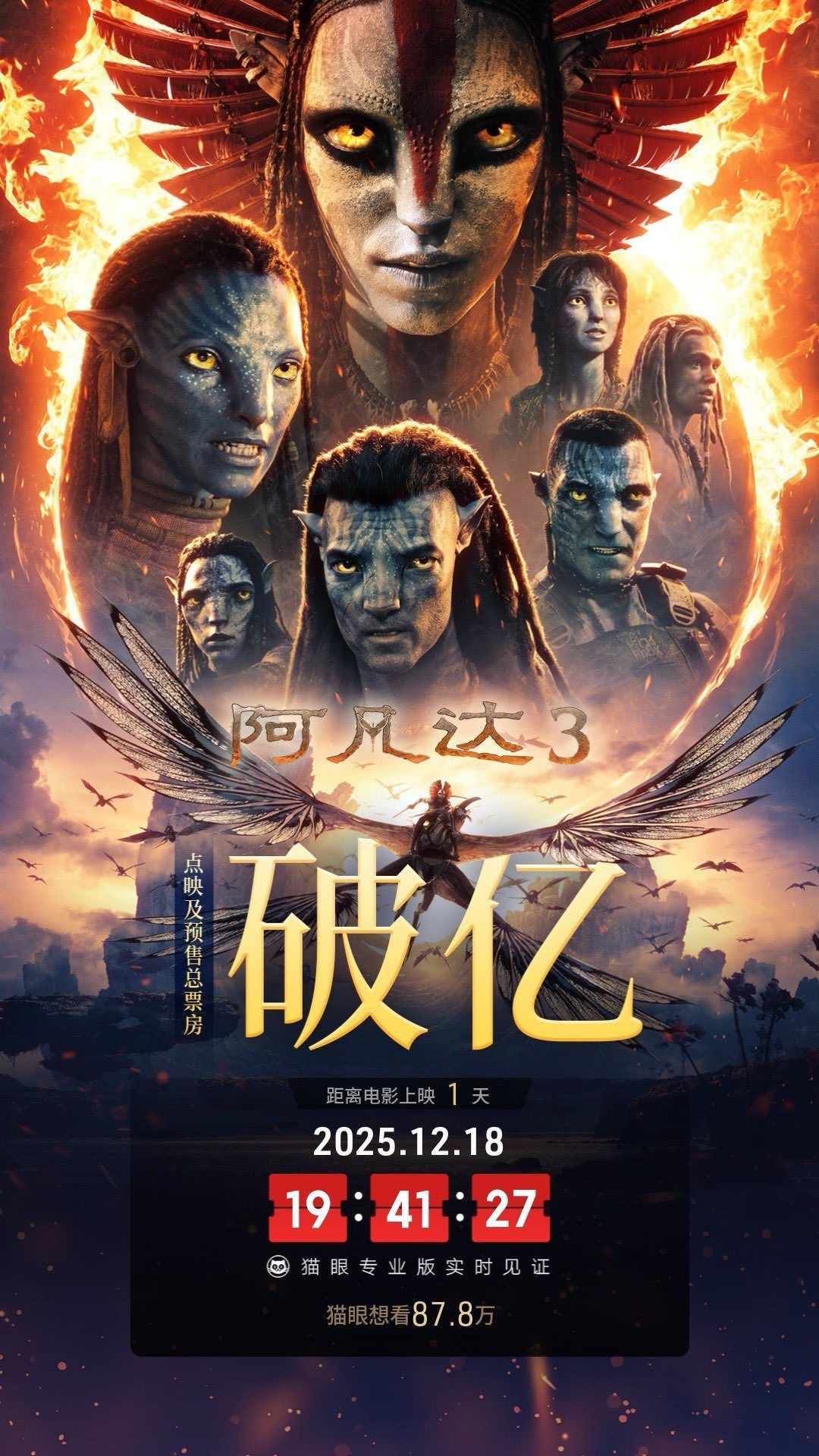截至12月18日19时41分,《阿凡达3》累计预售票房(含点映)已破1亿元,成为自《阿凡达2》以来首部预售破亿的进口真人电影。影片于12月19日正式上映。