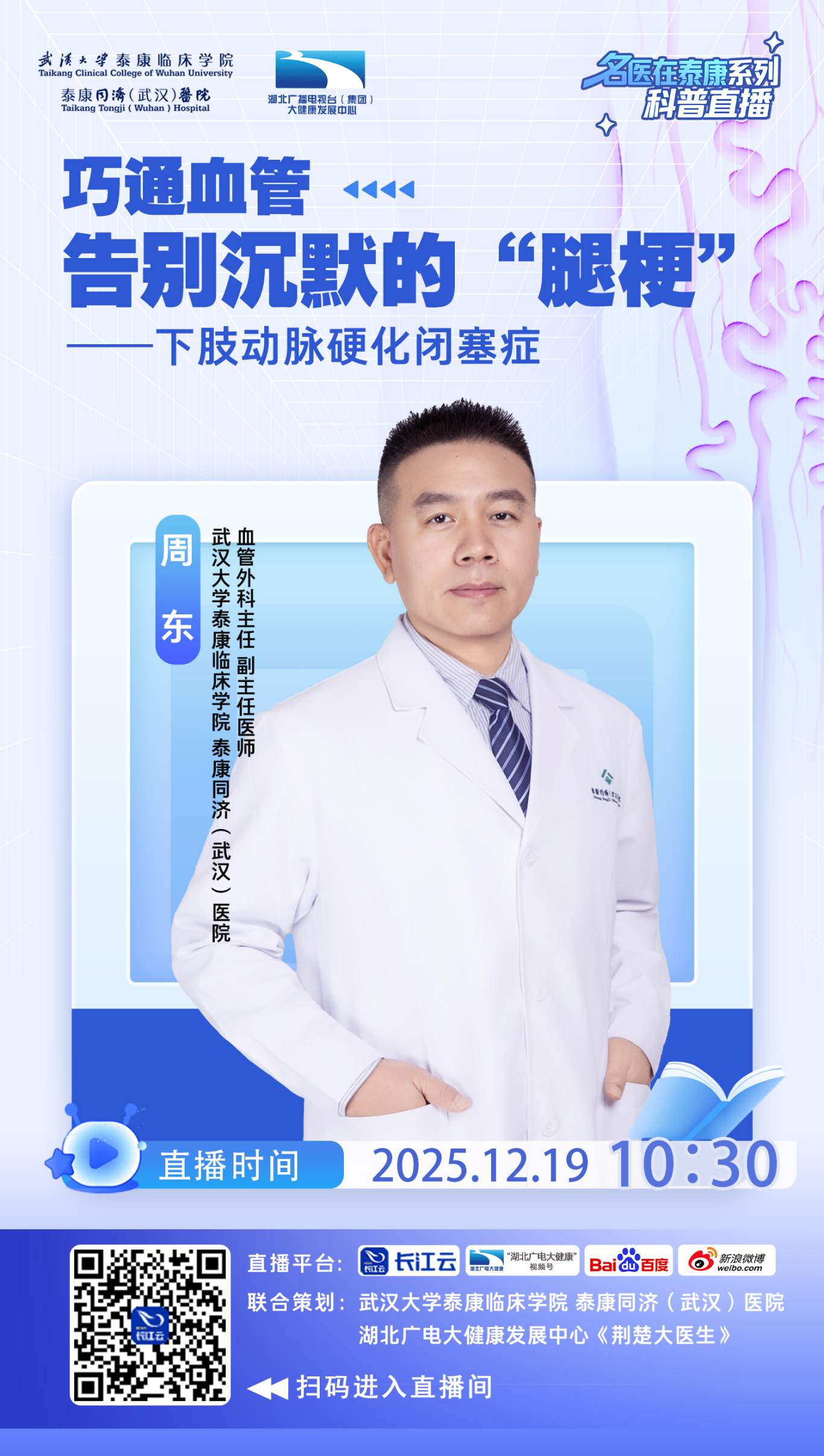 12月19日10:30,武汉大学泰康临床学院 泰康同济(武汉)医院 血管外科主任 副主任医师 周东 为您带来权威解答。