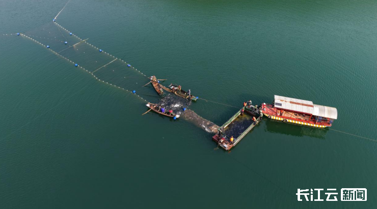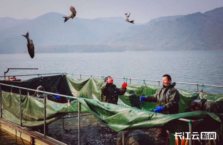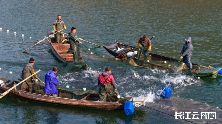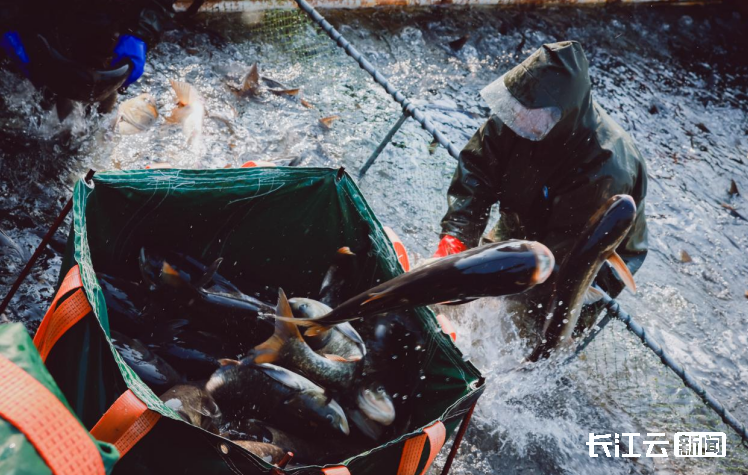 撒网、捕捞、收网、分拣、装篮……一大早,在襄阳市南漳县云台山水库,捕鱼师傅们在吆喝声中齐心协力收紧大网,顿时一条条受惊的鱼儿不断腾跃出水面,水花四溅,呈现出一派鱼跃人欢、渔获满舱的丰收盛景。