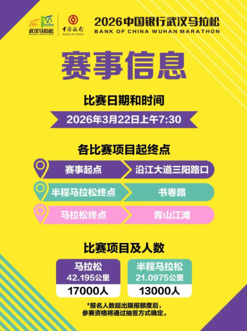 根据赛程安排,2026年武汉马拉松全马项目(42.195公里),参赛人数为17000人;半程马拉松项目(21.0975公里),参赛人数为13000人,全马终点调整至青山江滩。
