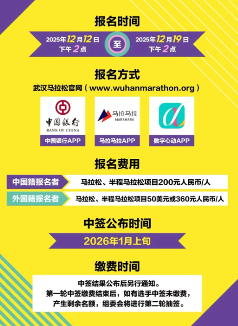 2026中国银行武汉马拉松已定于2026年3月22日7点30分鸣枪起跑,目前,2026年武汉马拉松报名时间(2025年12月19日下午2点)还有最后1小时,还未报名的跑友可抓紧时间报名参加。报名渠道如下: