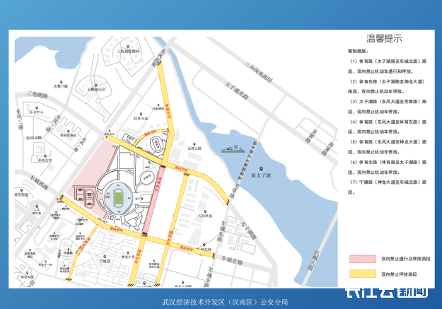 1.由于活动当天观众较多,体育中心周边道路车流增多,前往体育中心周边的人员请尽量错峰出行,高峰时段请做好出行规划,尽量避免进入体育路(东风大道至神龙大道)、太子湖路(东风大道至芳草路)、体育东路、车城北路(东风大道至车城东路)、宁康路路段,需通行该区域的人员或车辆,可选择绕行神龙大道、沌阳大道、太子湖北路、江城大道等外围道路。