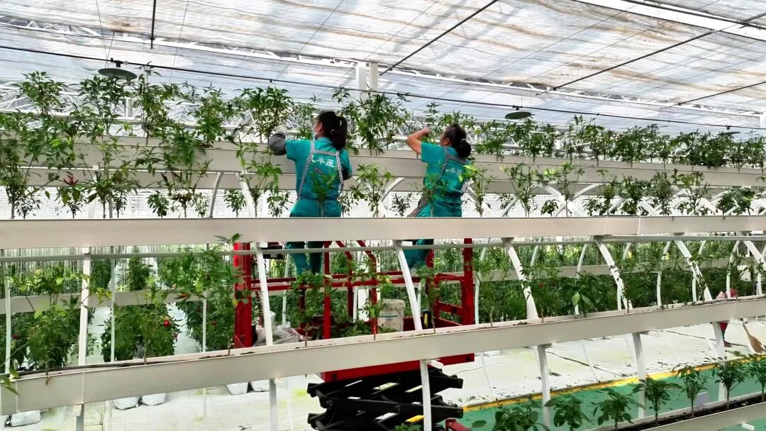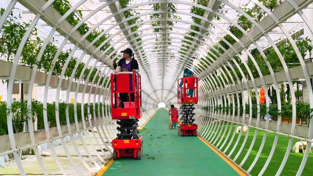 通过直播镜头,黑色辣椒 、巨大蛇瓜、迷你茄子等各类蔬果在棚内构成了一幅幅美丽的画卷,游客穿梭其中,既可观光又可以采摘。