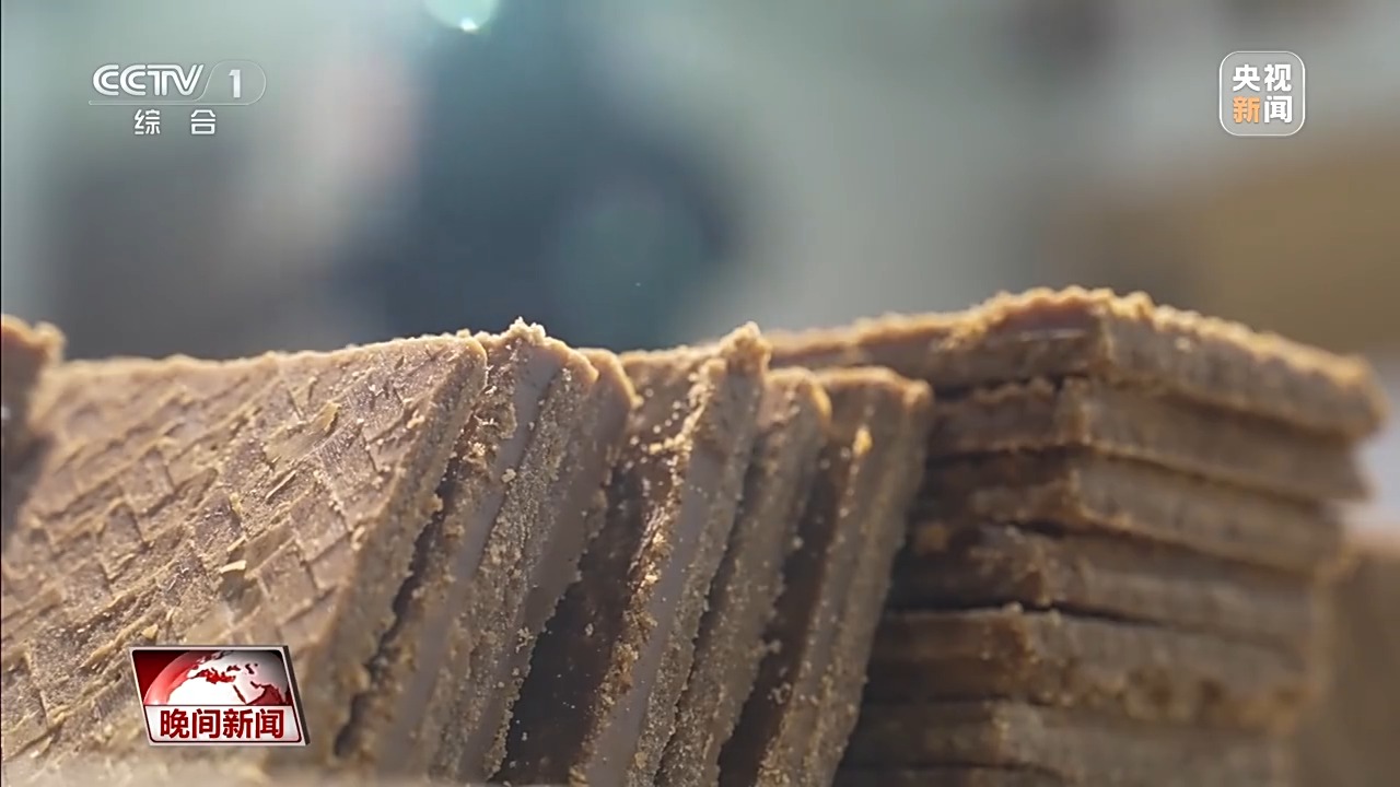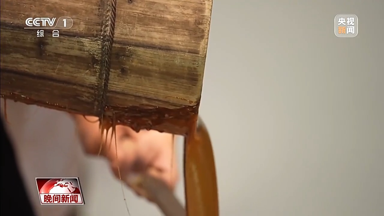 经过近3小时的高温熬煮后,师傅们会将糖浆倒入特制的竹簟上,随后用木质糖刀反复搅打,等到糖浆冷却成固体,表面出现像“蝴蝶花”一样的白色结晶后,就算制作完成了。这种方法做出来的红板糖爽口松脆、清香甘甜、入口即化。