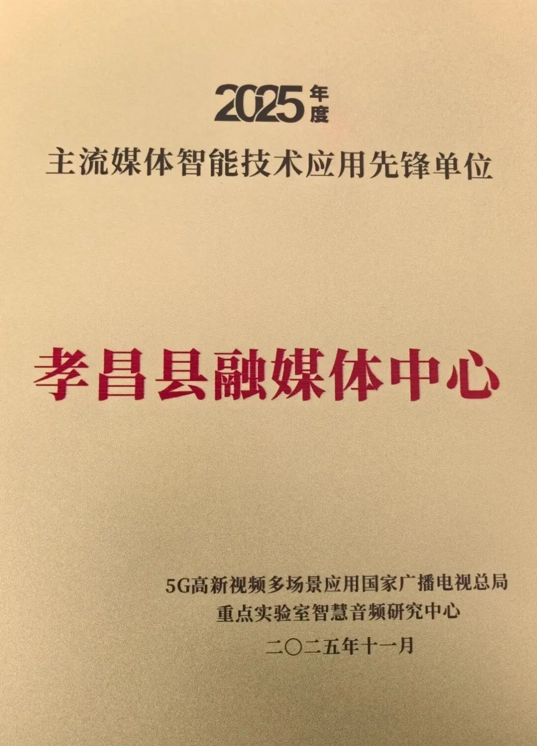 12月18日,孝昌县融媒体中心凭借在广播AI智能技术应用领域的突破性探索与显著成效,被5G高新视频多场景应用国家广播电视总局重点实验室智慧音频研究中心授予“主流媒体智能技术应用先锋单位”称号。这一国家级荣誉的获得,标志着孝昌融媒在媒体信息化与智能化转型道路上迈出关键步伐。
