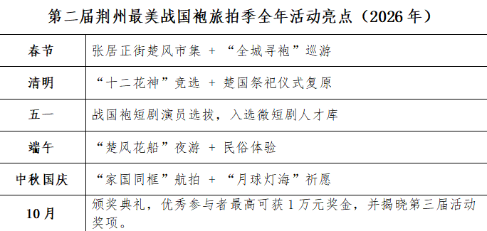 从古城文博到乡村自然,从楚风巡游到光影盛宴,2026年的荆州,将成为传统与潮流交织的文化舞台。期待每一位同袍与爱好者,穿上战国袍,走进荆州,用镜头记录属于自己的“映像荆州”,让千年风华,在每一次快门声中永续流传。