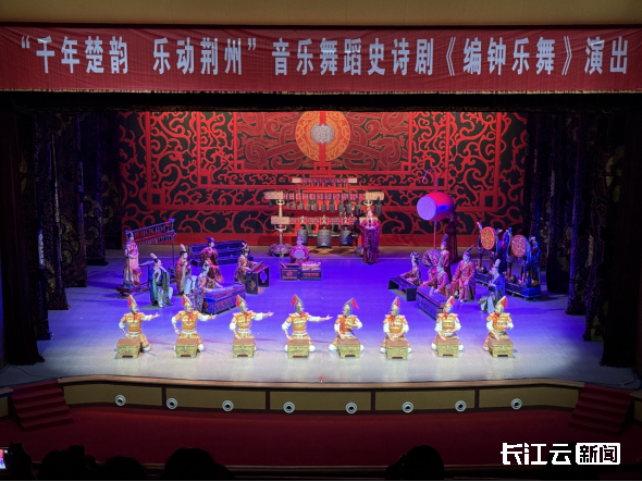 今晚7点半,《编钟乐舞》在荆州市凯乐大剧院震撼上演。《编钟乐舞》以伟大诗人屈原的爱国主义思想为核心,用歌、乐、舞相结合的艺术形式,将曾侯乙墓出土的编钟、编磬、建鼓等数十件古乐器仿制品,同台演奏,“金、石、丝、竹、匏、土、革、木”,八音合鸣,重奏千古绝响,辉煌呈现了古代楚国文化艺术、风俗民情、祭祀、农事、征战及宫廷宴乐等情景,把古代荆楚人民的艺术风貌、盛楚乐章历史再现于舞台。