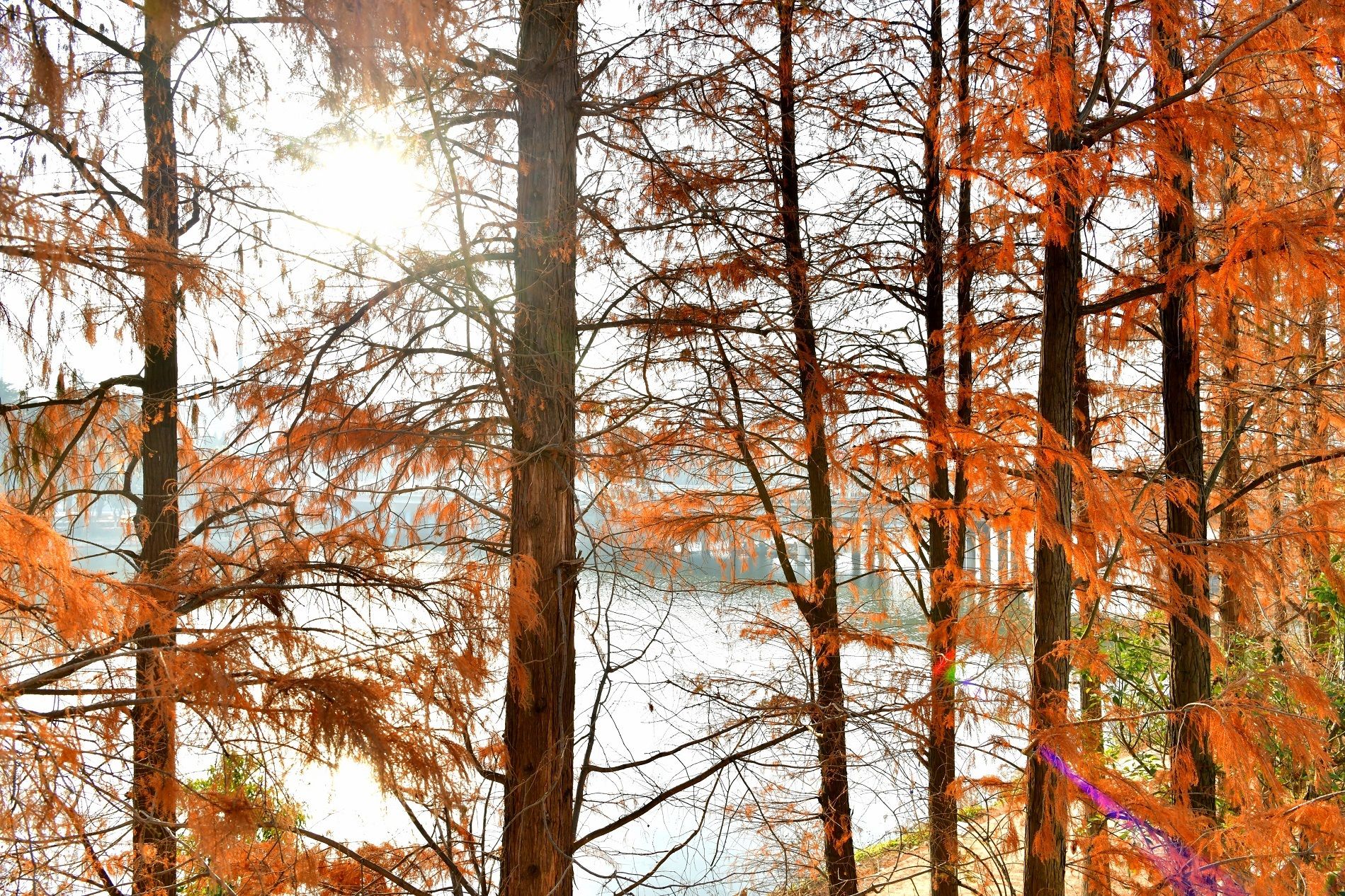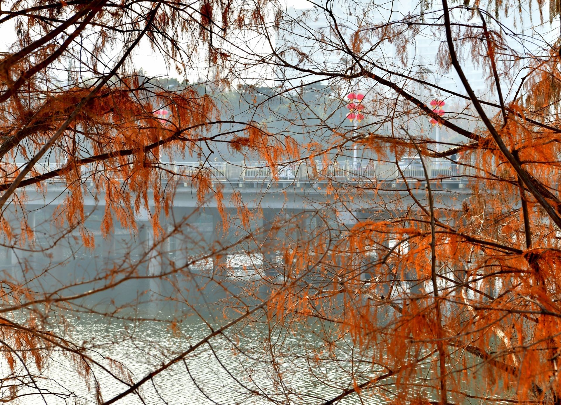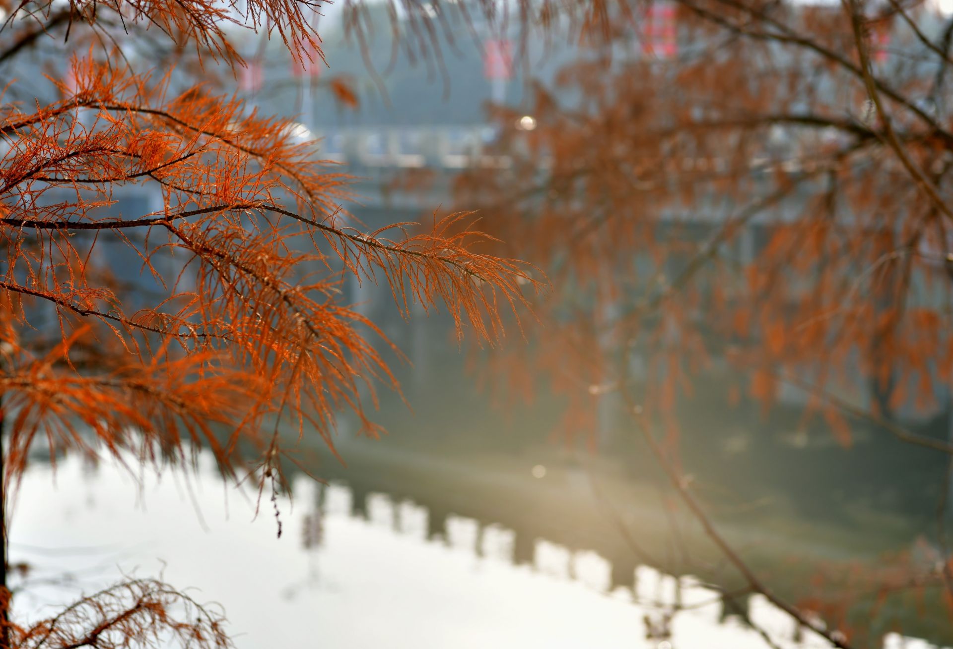 仲冬,在湖北省枣阳市沙河城区段,一树树红杉挺拔水岸,叶红似火,点缀绚烂冬日,诠释出顽强与坚韧,呈现一抹唯美的暖色景观。