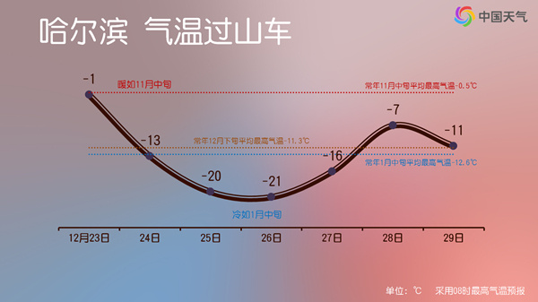在即将出现明显降温的区域中,东北地区气温震荡最为剧烈,降温过后气温偏低幅度也更大。以哈尔滨为例,常年12月下旬平均最高气温为-11.3℃,今天最高气温可达-1℃;明天起三天内气温将持续下降,最高气温将迎来今冬首次跌破-20℃。这意味着当地将从常年同期少见的温暖,迅速转为较常年同期大幅偏冷,气温波动极为剧烈。