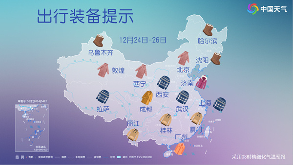 未来三天(12月23日至25日),我国大部地区将出现明显降温,其中东北地区降温最为剧烈,哈尔滨最高气温或今冬首次跌破-20℃,降温前后冷暖反差极大,需注意保暖防寒。