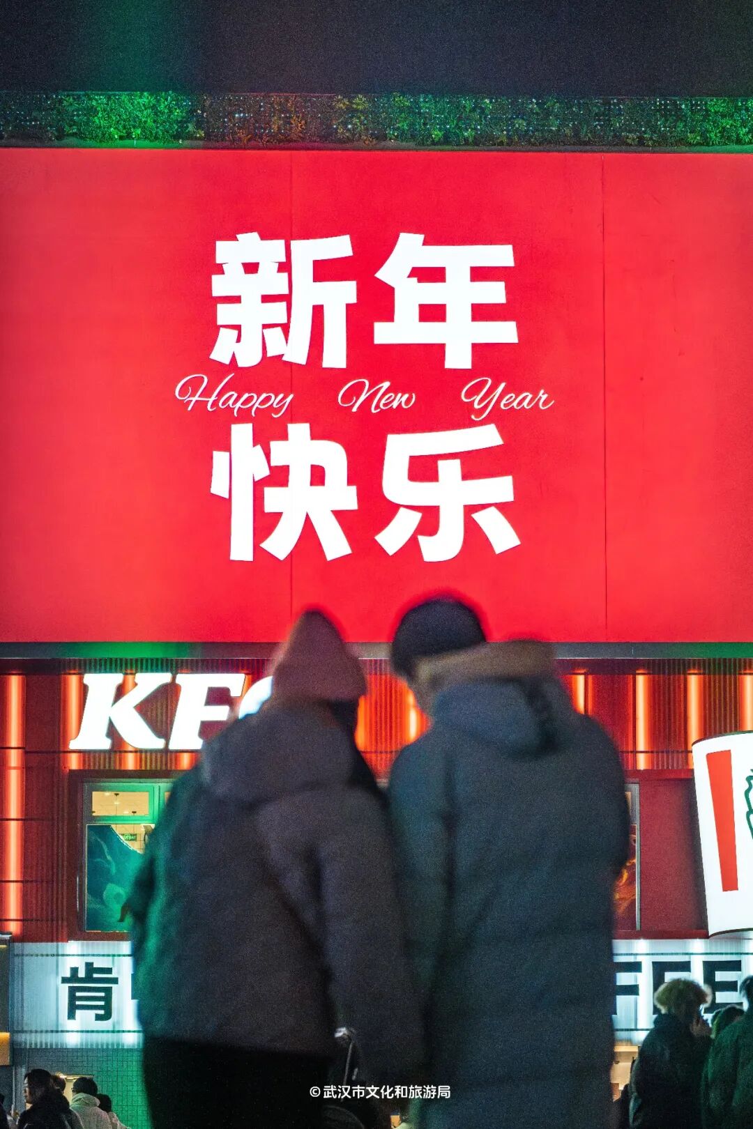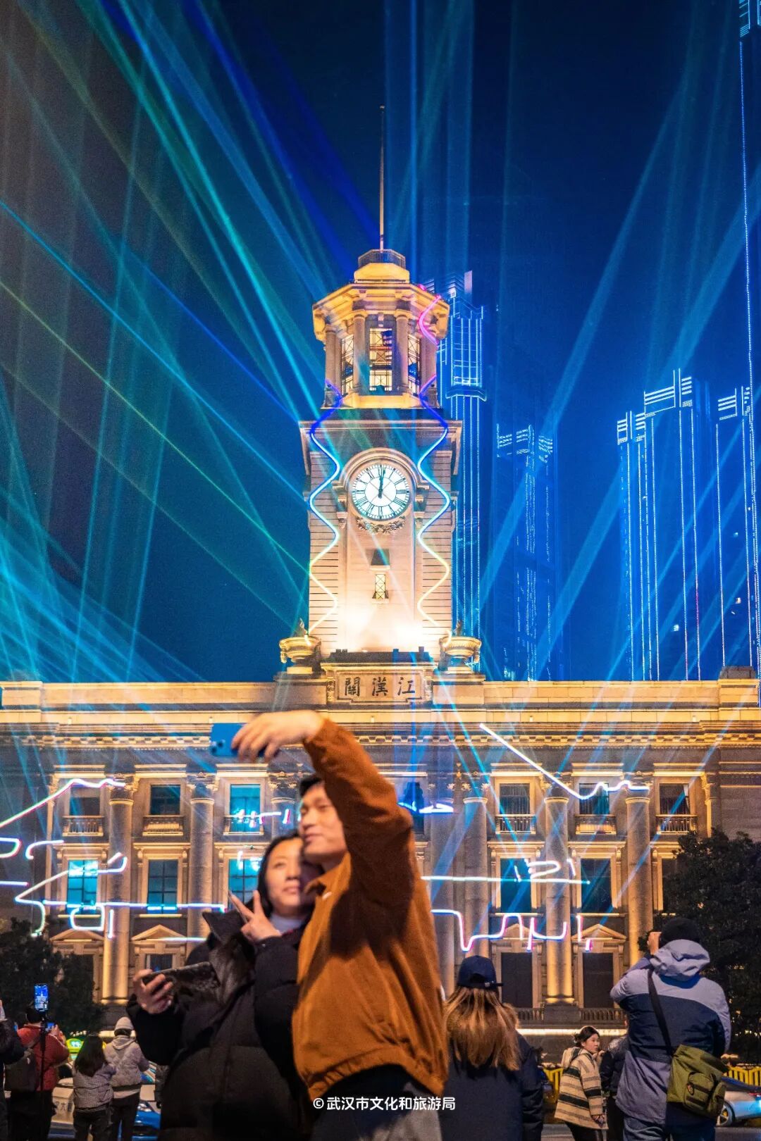 江汉关大楼开启激光秀+交响乐+钟声合演,黄鹤楼、楚天之眼摩天轮、龟山电视塔、东湖之眼摩天轮等,9座城市地标同步启动跨年灯光秀,全城各大景区上新花灯节、打铁花、篝火晚会等活动,点亮武汉各处角落。