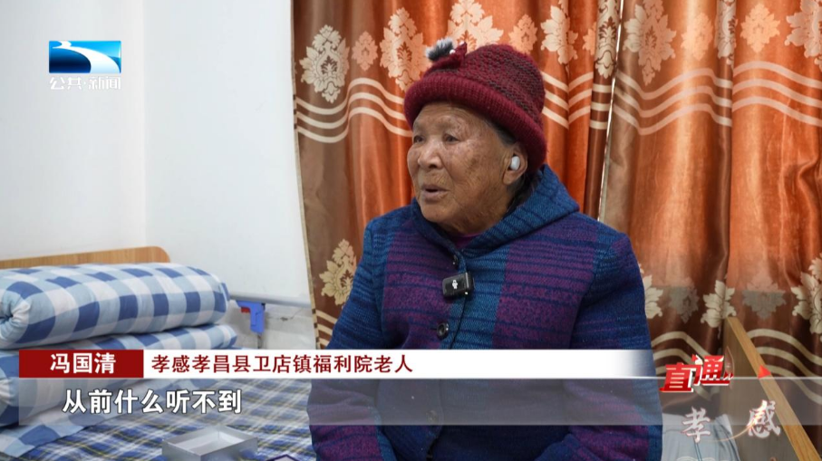 孝感孝昌县卫店镇福利院老人 冯国清:从前什么听不到,现在(助听器)一戴,这清楚,都听得到。