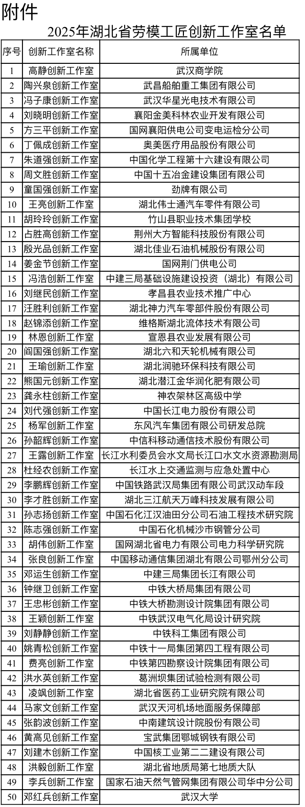 2025年湖北省劳模工匠创新工作室名单出炉