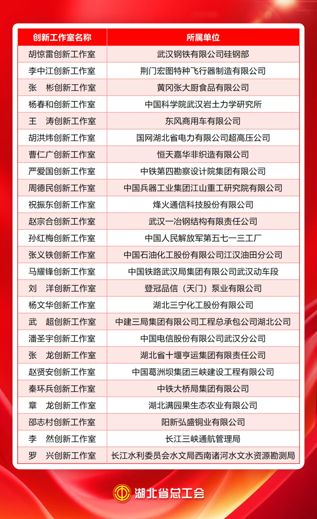 近日,全国总工会公布了2025年全国总工会重点支持建设的全国劳模工匠创新工作室名单。湖北省共有25家创新工作室上榜。看看有没有你们单位的创新工作室。