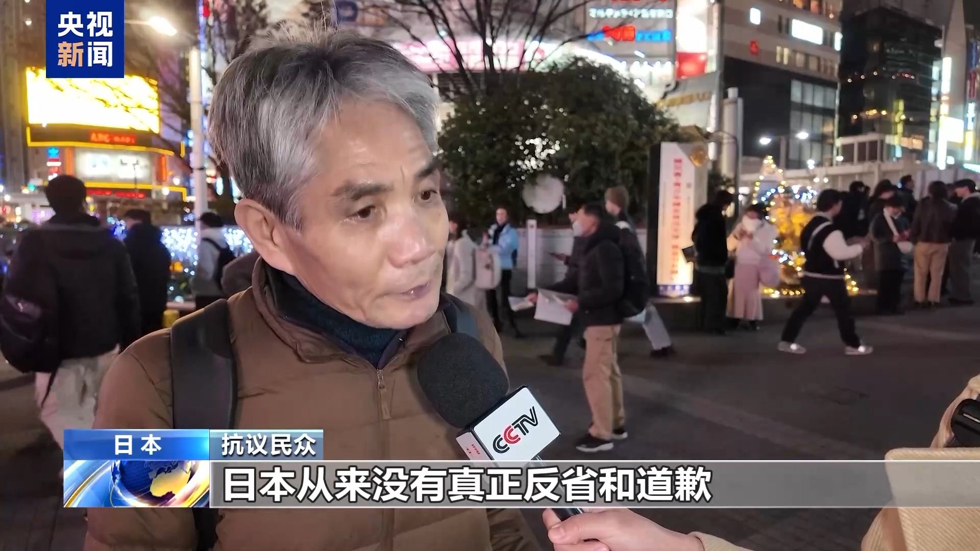 针对日本首相高市早苗涉台错误言论,23日晚,日本民众在东京闹市区再次举行抗议集会,要求高市早苗立即撤回错误言论。