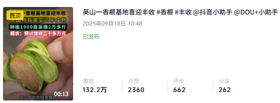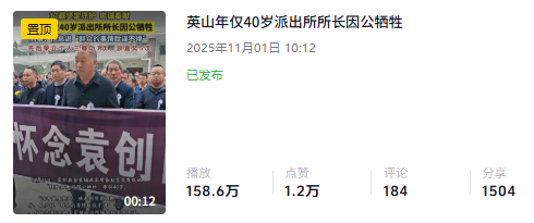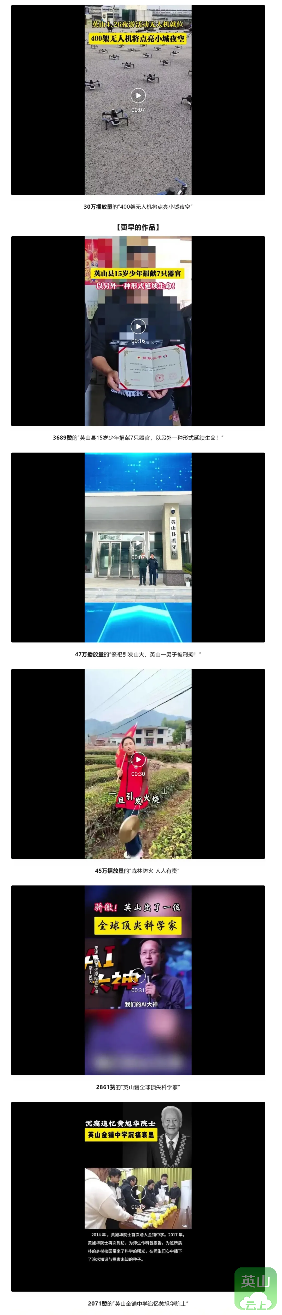 今年2月以来,英山县官方媒体抖音号“英山昇音”采用“抓早抓小 入目入耳”运维路线,通过强化制度建设、人员培训和创作思路革新,视频采用大媒化制作风格,专班人员捕捉新闻敏锐性不断提高,作品品质不断提升,账号传播力大幅上涨,持续推出了多个爆款作品。如:2025年9月18日由该账号全网首发的“英山一香榧基地喜迎丰收”一经推送,24小时内即获得130余万播放量;2025年11月1日发布的“英山年仅40岁派出所所长因公牺牲”发布一周内,累计获得近160万播放量,点赞达1.2万......