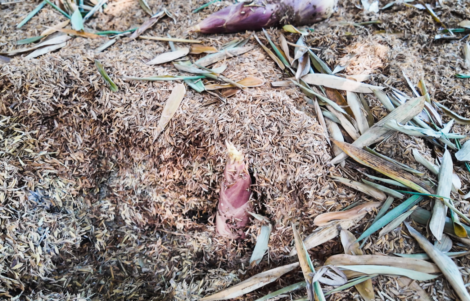 沿着蜿蜒的乡村小路进入竹林,10余名工人穿梭其间,将谷壳均匀铺撒在雷竹根部。三层厚达25至30厘米的谷壳“棉被”,既能锁住地温,又能为雷竹生长积蓄养分,为鲜笋提前上市筑牢基础。