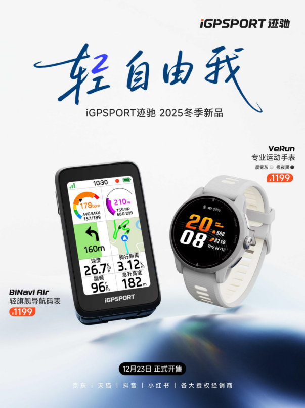 12月23日,全球知名自行车GPS码表品牌iGPSPORT迹驰,面向全球市场发布了新一代轻旗舰导航码表 BiNavi Air,以及首款专业运动手表 VeRun。这两款新品是对iGPSPORT迹驰产品矩阵的进一步完善,更是iGPSPORT迹驰从专注骑行运动,迈向跑步等多运动场景的关键一步。产品定价方面,BiNavi Air和VeRun定价均为1199元。