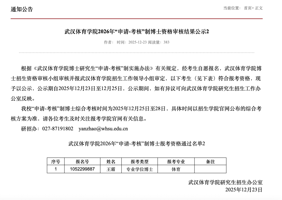 12月23日,武汉体育学院研究生院官网发布公示显示,王霜已通过学校2026年“申请—考核”制博士报考资格,报考类型为专业学位博士,报考专业为体育。