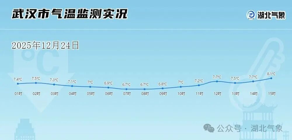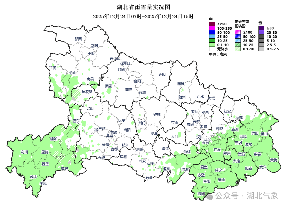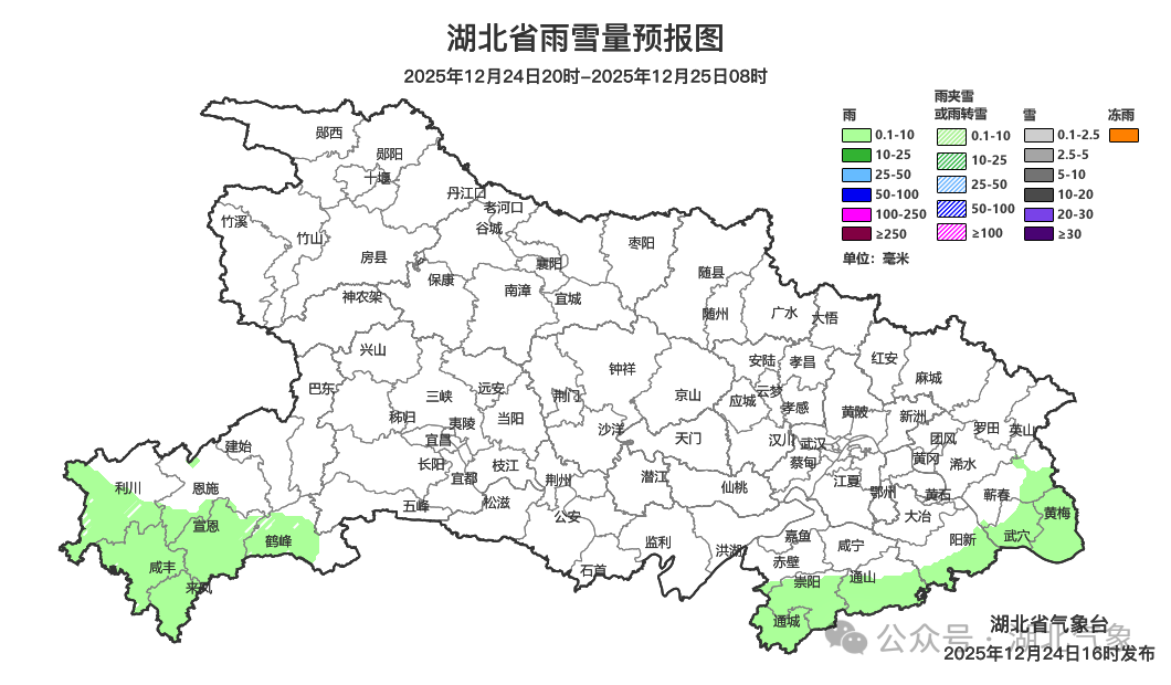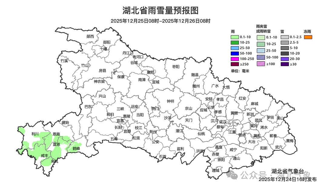 12月24日20时-25日08时,恩施地区阴天有小雨,高海拔地区有雨夹雪或雪;鄂东南南部零星小雨转阴天;其他地区阴天到多云。最低气温鄂西北-1~2℃、其他地区2~5℃,偏北风3级,阵风4到5级。