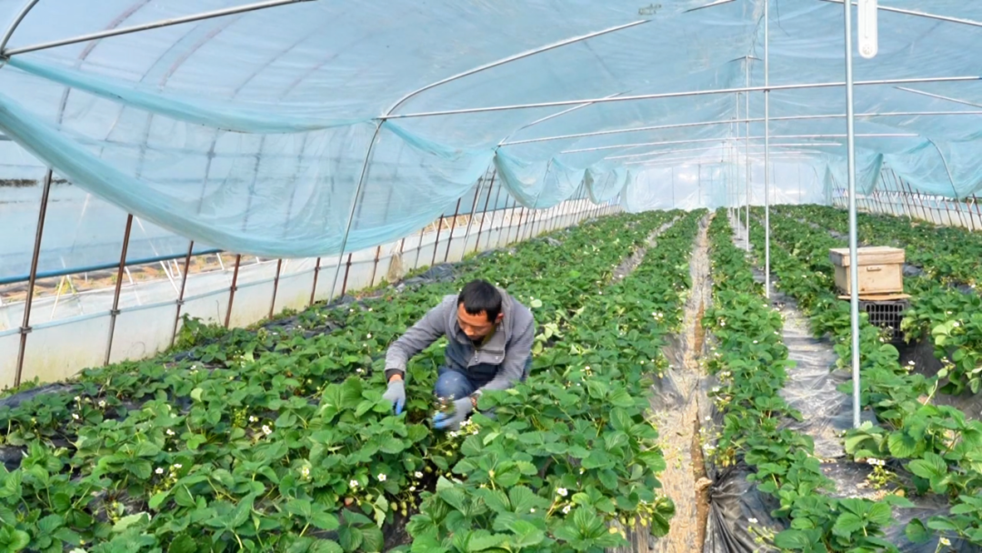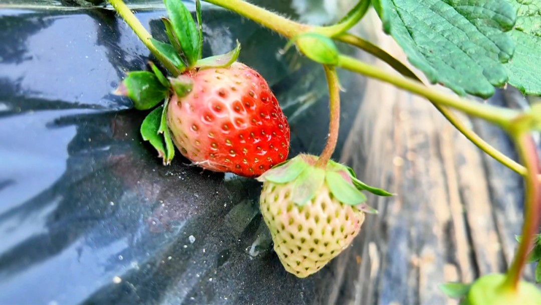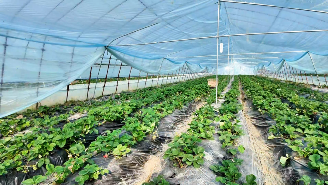 走进丰山镇昌丰生态园的温室大棚,一排排草莓植株整齐排列,绿叶间点缀着一串串即将成熟的草莓,鲜红与青翠交相辉映,长势喜人。然而,这片充满生机的土地,几年前还处于闲置状态。