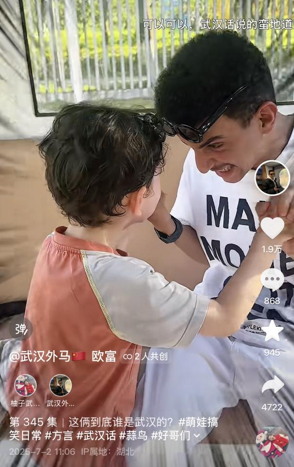凭借着一张外国人面孔,他的内容创作有着别人无法模仿的优势,也正因这种反差感让他在2025年收获了泼天的流量,与网红博主“武汉小柚子”的联动视频更是十分出圈,两人在武汉园博园相遇,一个外国小伙与一个混血小孩用武汉话激烈“抖狠”(武汉话,意指亮出狠劲比拼),反差感拉满的画面吸引大量网友点赞。