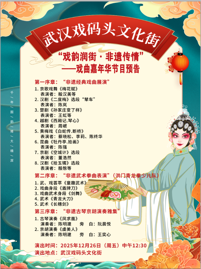 12月26日,武汉戏码头文化街将推出“戏韵润街,非遗传情”戏曲嘉年华主题活动,以开放式、沉浸式的体验形式,为市民和戏迷打造一场融合传统戏曲与非遗文化的冬日盛宴。