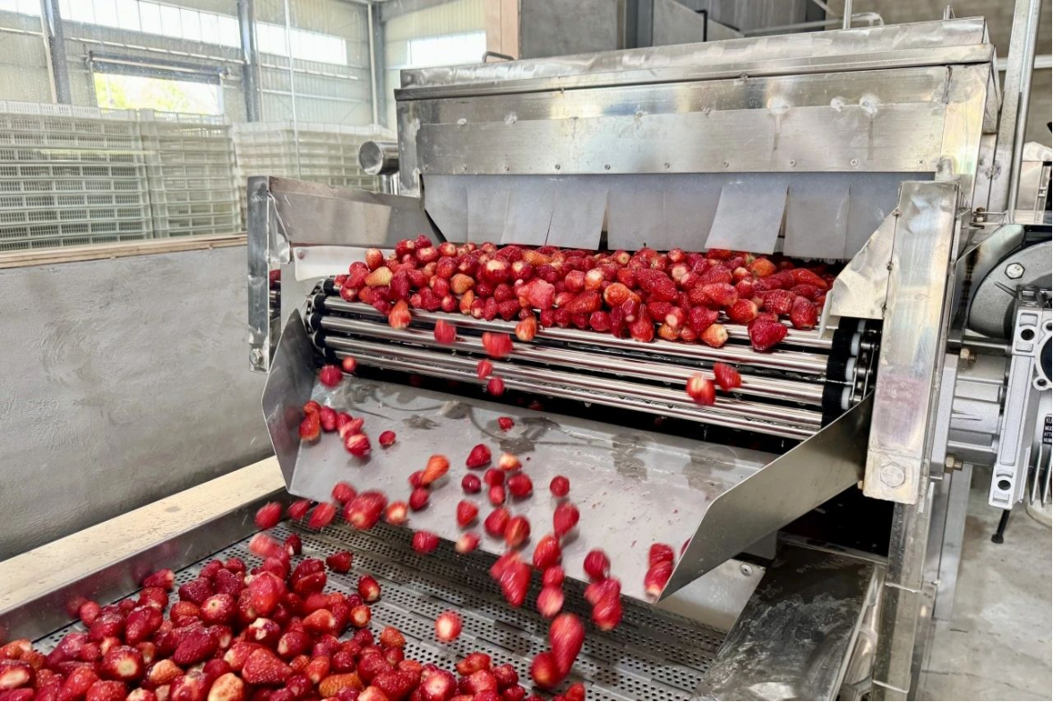 “以前3到5月,草莓尾果没人要,只能烂在地里,看着心疼。”岗上熊村村民李大姐的话,道出了曾经草莓种植户的困扰。如今,这一难题在木兰红草莓小镇得到完美解决。2025年,小镇投资800万元建成湖北省唯一的草莓初加工厂,通过清洗、冷冻等工艺,将尾果制成冷冻果、果丁、果浆,成为酸奶、茶饮企业的抢手原料。