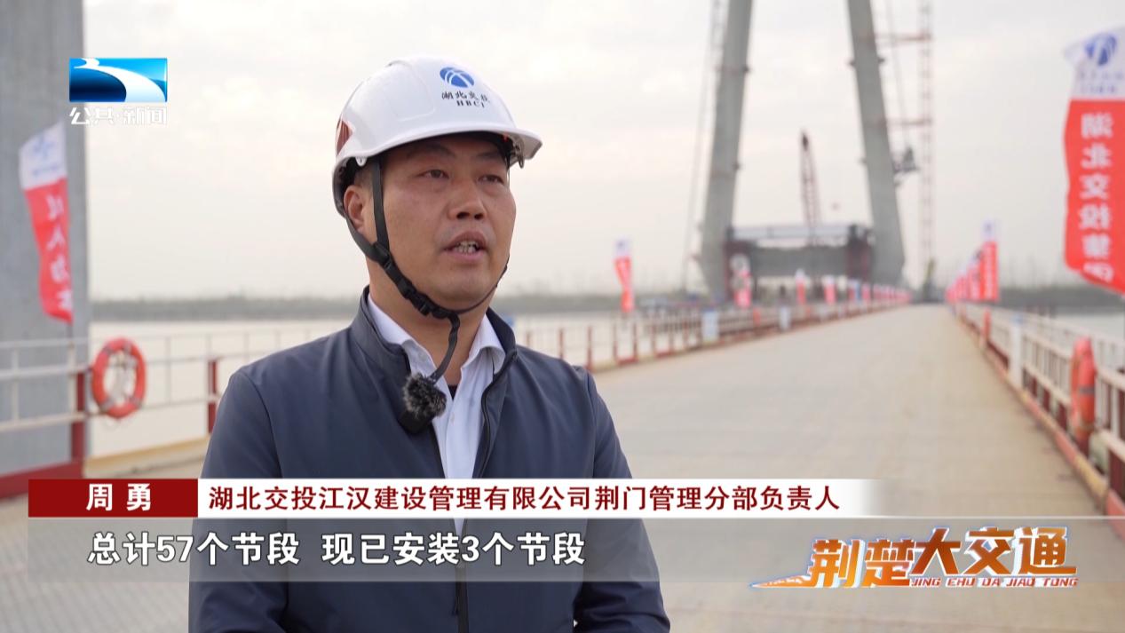 湖北交投江汉建设管理有限公司荆门管理分部负责人 周勇:总计57个节段,现已安装3个节段,我们围绕技术、工艺、装备三大维度进行创新突破,预计2026年10月合龙。