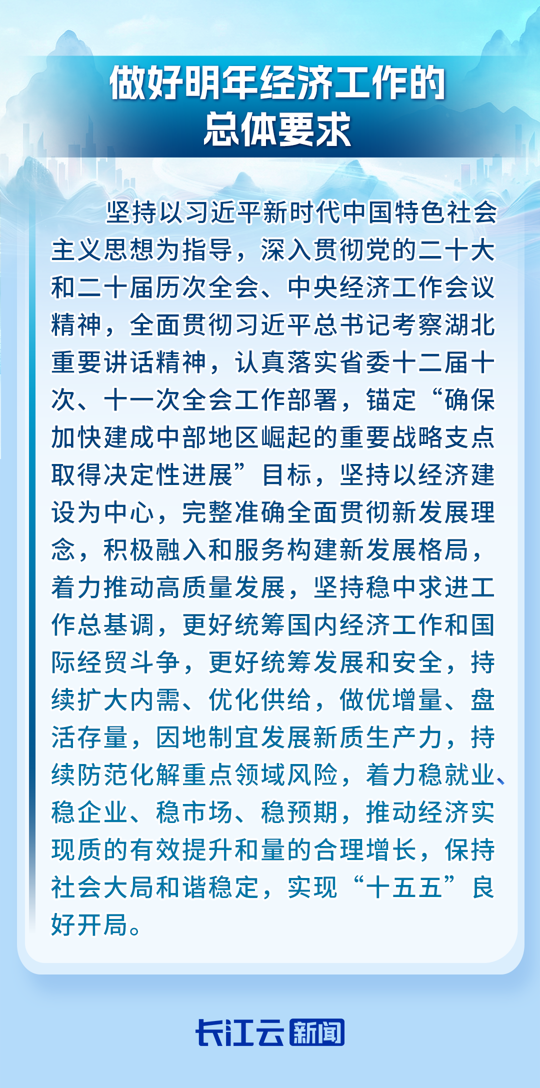 会议号召,全省上下要更加紧密地团结在以习近平同志为核心的党中央周围,牢记嘱托、感恩奋进,奋力完成明年经济社会发展目标任务,为实现“十五五”良好开局、推动加快建成中部地区崛起的重要战略支点取得决定性进展作出新的更大贡献。