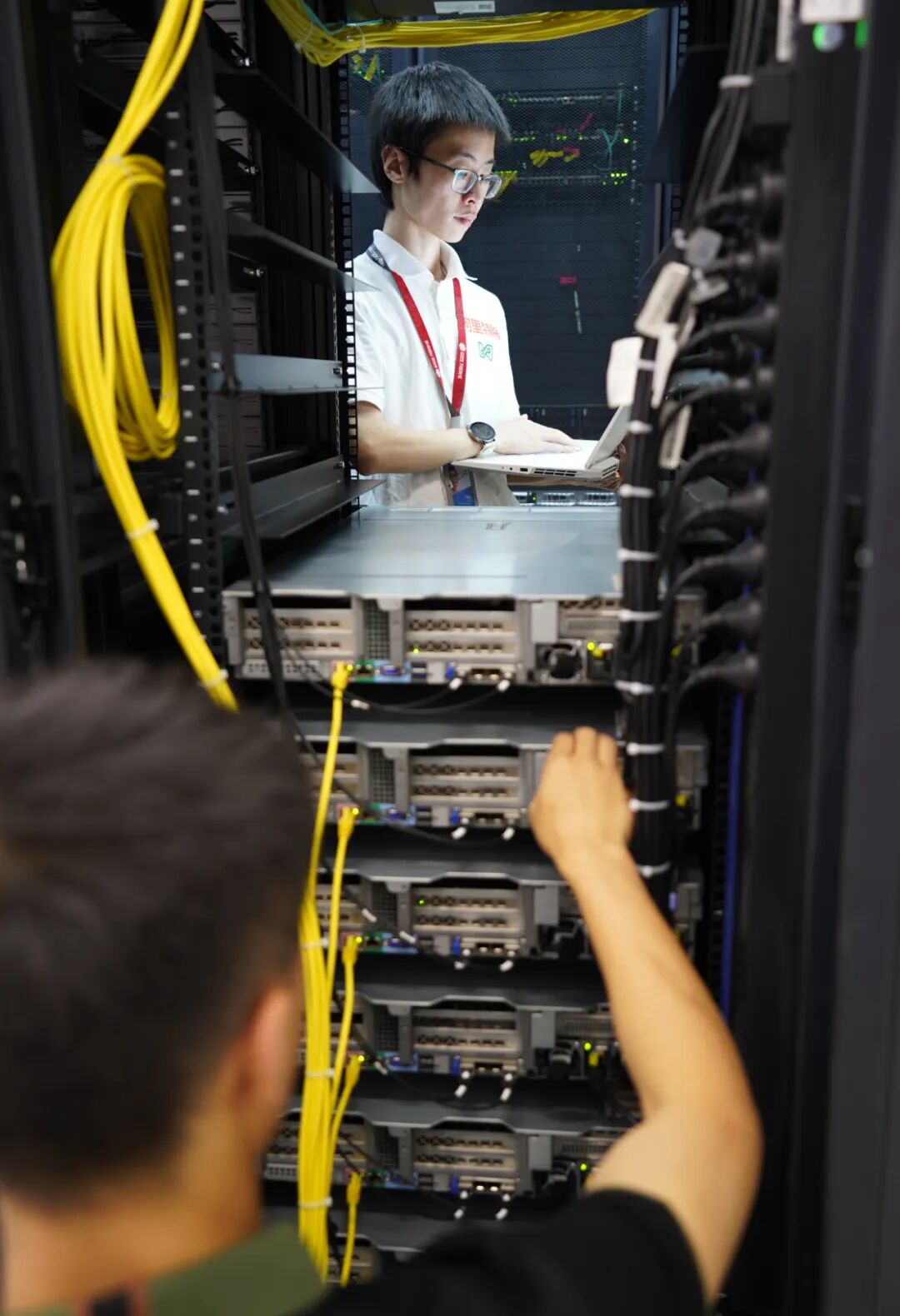 光谷未来科技城迈异超云中心机房,技术人员正在巡检、调试服务器(魏铼|摄)