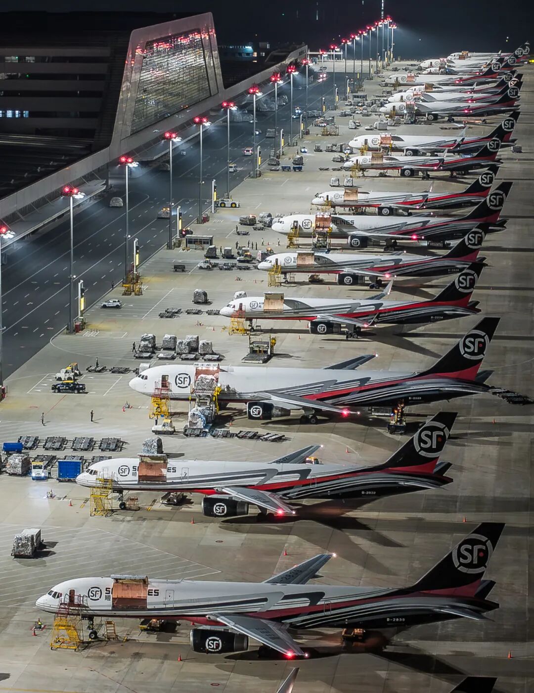 凌晨,鄂州花湖国际机场停机坪一片繁忙,几十架货机依次排列,构成壮观的“飞机雁阵”。(薛婷|摄)