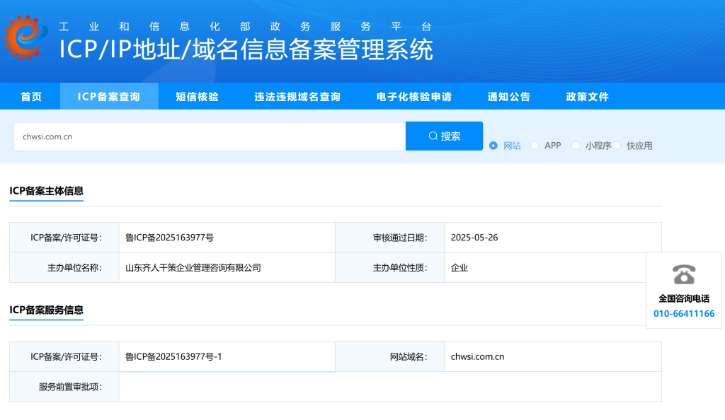 通过工信部ICP/IP地址/域名信息备案管理系统查询,记者发现.chwsi.com.cn域名的注册方为山东齐人千策企业管理咨询有限公司,其真实备案号为鲁ICP备2025163977号,于2025年5月26日审核通过。天眼查信息显示,该公司成立于2020年,注册地在山东省潍坊市。