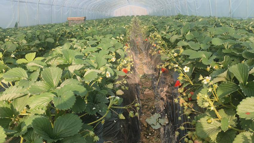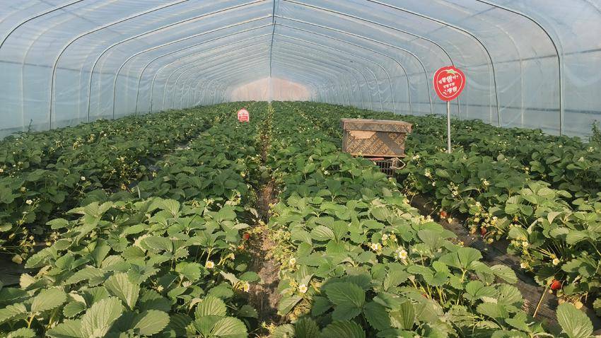 “一棚双收”是基地的一大特色,草莓花开旺盛、青果满枝,预计今年产量可观,而蜜蜂采酿的蜂蜜也带着淡淡的草莓清香,成为基地的“隐藏宝藏”。