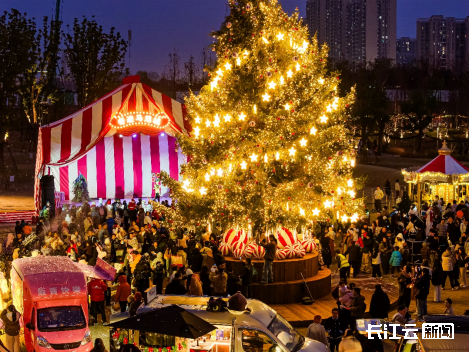 星光点缀的15米真云杉圣诞树,红白条纹的马戏帐篷,悠悠转动的旋转木马……12月20日起,武汉麓客岛化身“奇遇圣诞岛”, 将沉浸式童话场景、互动体验与自然深度融合,打造出一座可游、可感、可参与的冬日童话秘境。活动开放首日,便吸引数万市民游客登岛,共同走进这场童话。