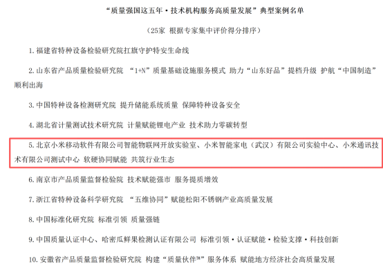 12月19日,由中国质量报刊社主办的2025年度“质量之光”论坛在国家市场监督管理总局召开。论坛隆重揭晓了“质量强国这五年·技术机构服务高质量发展”典型案例。其中,小米武汉智能家电实验中心、智能物联网开放实验室、测试中心等三大国家CNAS认证实验室,作为一个整体在200多个评选案例中脱颖而出,入选全国典型案例,专家评价得分排名第五。