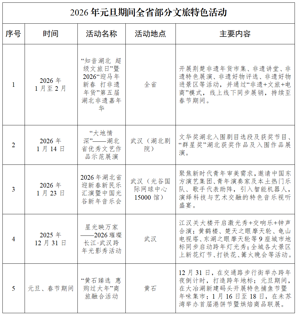元旦、春节期间,湖北各地聚焦传统文化与现代元素的创新融合,推出系列高品质、沉浸式文旅活动,打造多元体验场景。