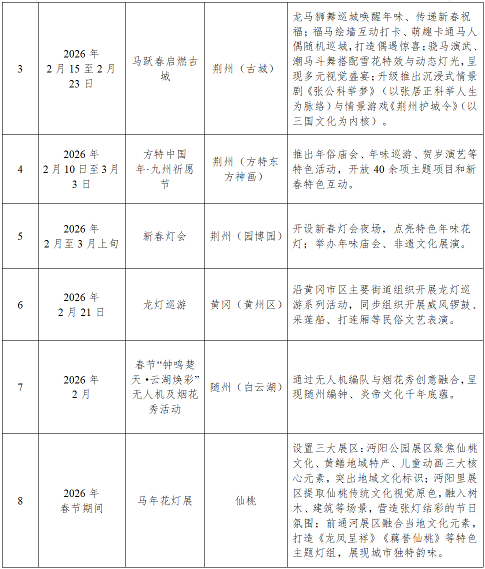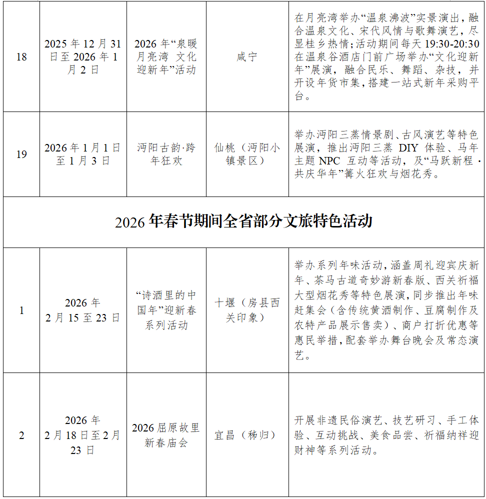 以下为各地部分活动信息,具体活动时间、参与方式及惠民政策细则,可持续关注“湖北文旅”官方平台及各市(州)、县(市、区)文旅部门发布的权威信息。预祝您在湖北度过一个愉快、圆满、充满美好回忆的新春佳节!