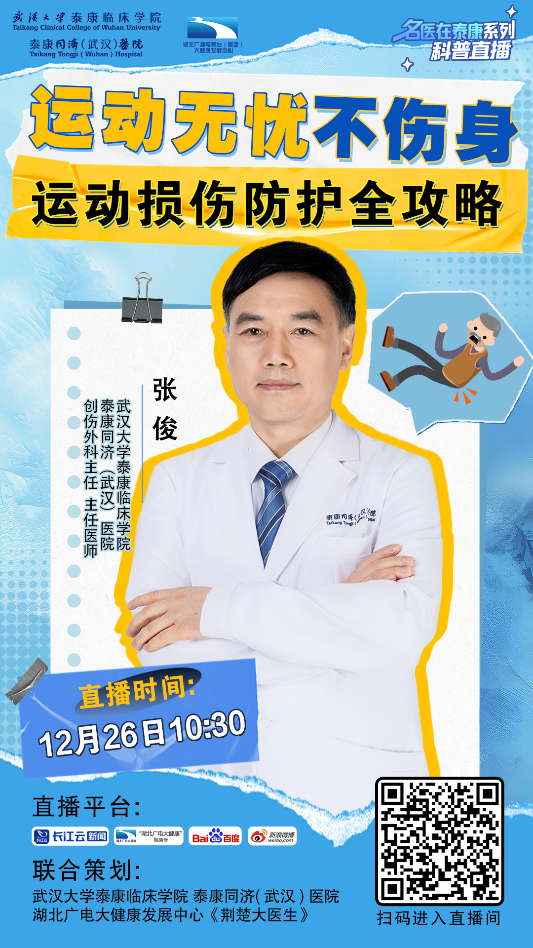 12月26日,武汉大学泰康临床学院 泰康同济(武汉)医院创伤外科主任、主任医师张俊做客直播间,结合临床案例,深度解析各类运动损伤的成因与防护,揭秘急救 "黄金法则",为不同年龄段的运动爱好者量身定制科学运动方案,献上运动损伤防护全攻略!