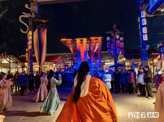 夜幕降临,钟祥莫愁村里,五光十色的霓虹灯像流星划破夜空,为景区披上一层灿烂的外衣,阳春邑正在上演的民俗节目表演《荆楚印象》被游客围得水泄不通。莫愁村营运部经理田俊梅说:“今天有5000多名游客进村游玩,较上周五增长20%以上。”