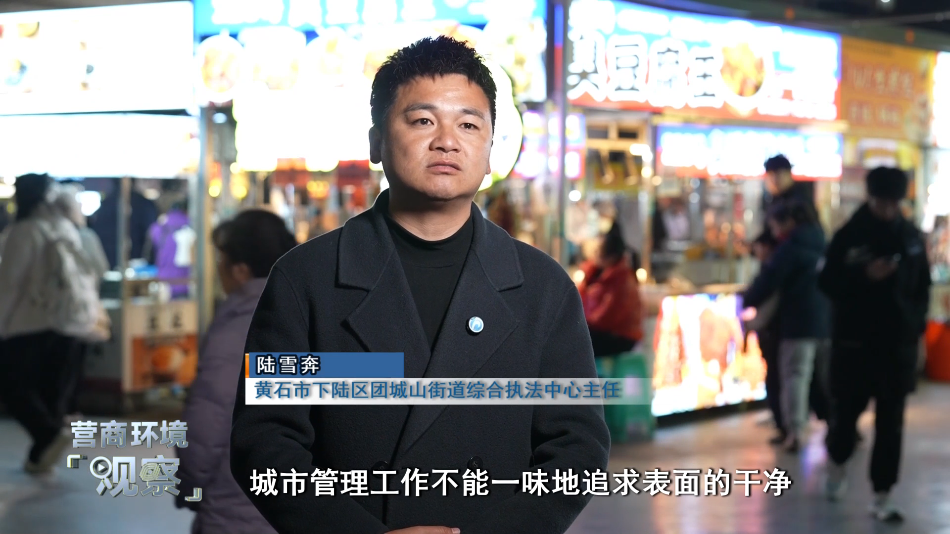 黄石市下陆区团城山街道综合执法中心主任 陆雪奔:我们街道联合区直各相关部门,反复开会,现场调研,统一了思想,城市管理工作不能一味地追求表面的干净,也不能图省事,核心是为人民服务,为群众找出路。因此我们决定转变思路,从以堵为主变为疏堵结合,由街道牵头,寻找合适场地投入资金,建设一个规范的夜市,引导摊贩们退路入市,集中规范经营,这样既能彻底解决占道安全、卫生等老问题,又能保住群众的“饭碗”,实现多赢。