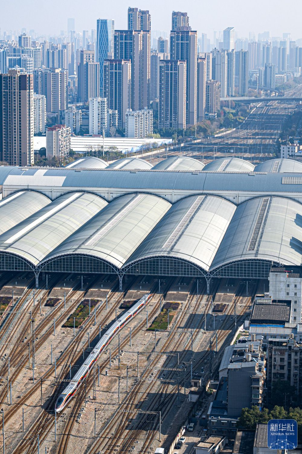 ↑ 12月26日,列车驶入宜昌北站(无人机照片)。