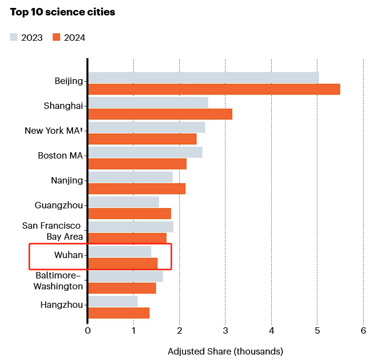 近期,施普林格·自然在线发布了《自然》增刊“自然指数—科研城市”,中国首次占据全球科研城市十强榜单一半以上席位。其中,武汉排名继续攀升,从第九位上升至第八位,介于美国旧金山湾区和美国巴尔的摩—华盛顿都市圈之间。