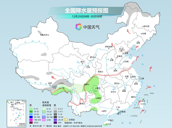 今天(12月29日),我国大部地区维持晴朗干燥天气,明后天雨雪天气发展增多,部分地区雨雪混杂,公众外出需小心慢行,注意交通安全。眼下,正有一股冷空气影响我国,华北、东北多地将现降温,明天开始新一股冷空气将接力,降温影响或延续至元旦假期,局地累计降温幅度可超10℃,公众需注意气温变化,及时添衣保暖。