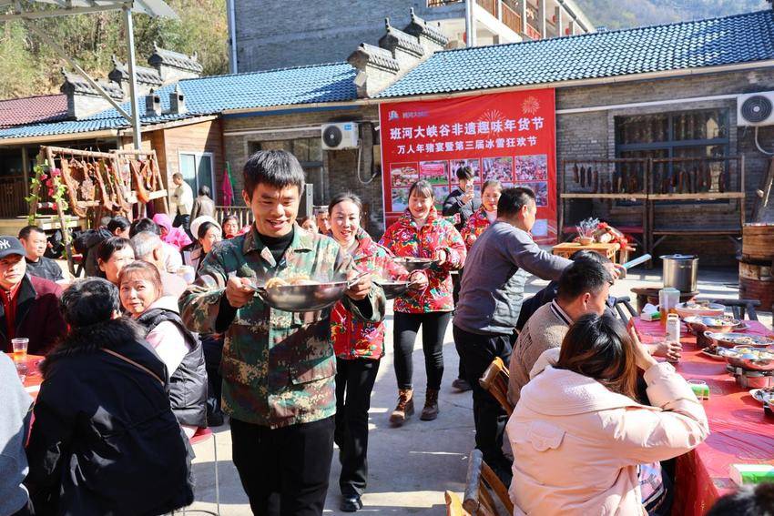 这里既有峡谷栈道的险峻,也有微滑雪场的欢腾。元旦期间,年货节同步开启,非遗八大碗年猪宴、山村土特产市集,满满都是山野的热情。