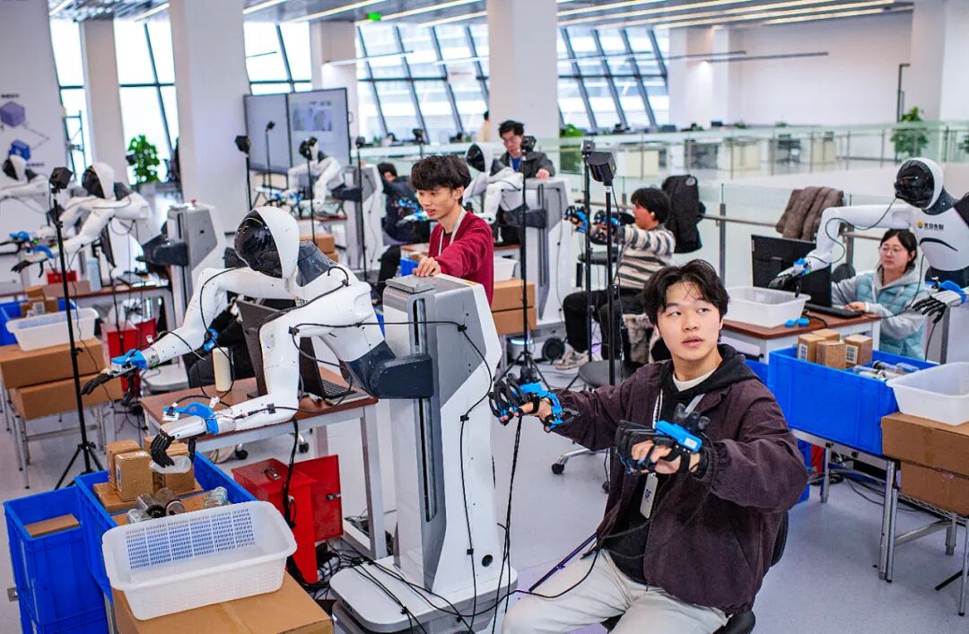 12月24日,湖北人形机器人创新中心,机器人训练师们戴上外骨骼手套正在工作。该中心有30多名机器人训练师,100余台训练机器人(朱熙勇|摄)